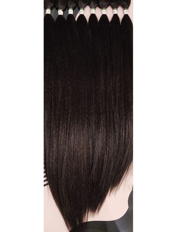 A Fibra Yaki tem aparência de um cabelo cacheado a crespo pranchado.