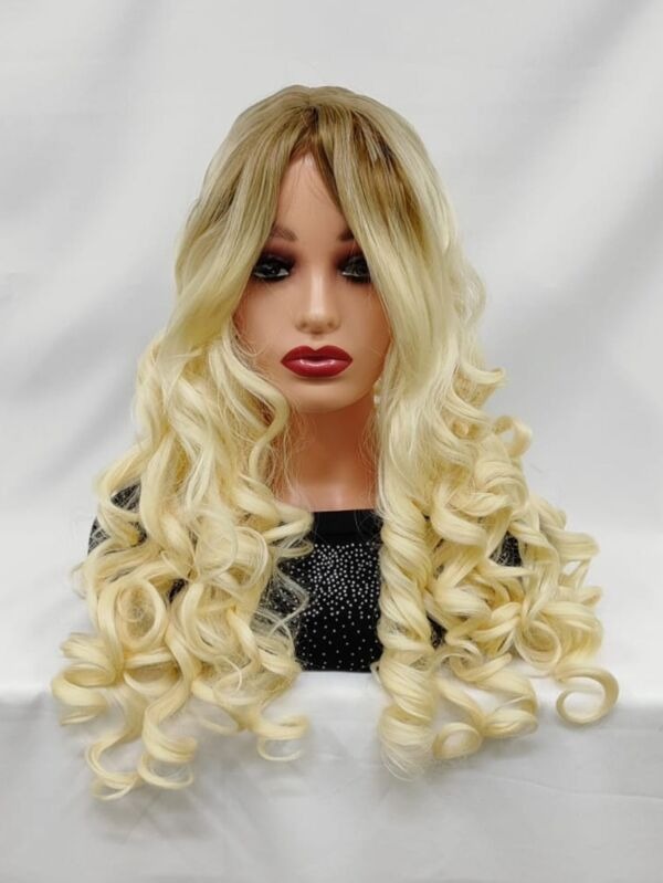Peruca longa cacheada com franja ombre castanho com fios loiro